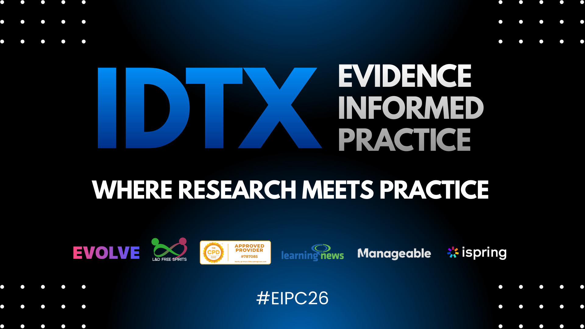IDTX Evidence Informed Practice takes place on 29th May 2026 at Eastside Rooms, Birmingham. The event is also sponsored by Evolve, L&D Free Spirits, iSpring Solutions, and Manageable.