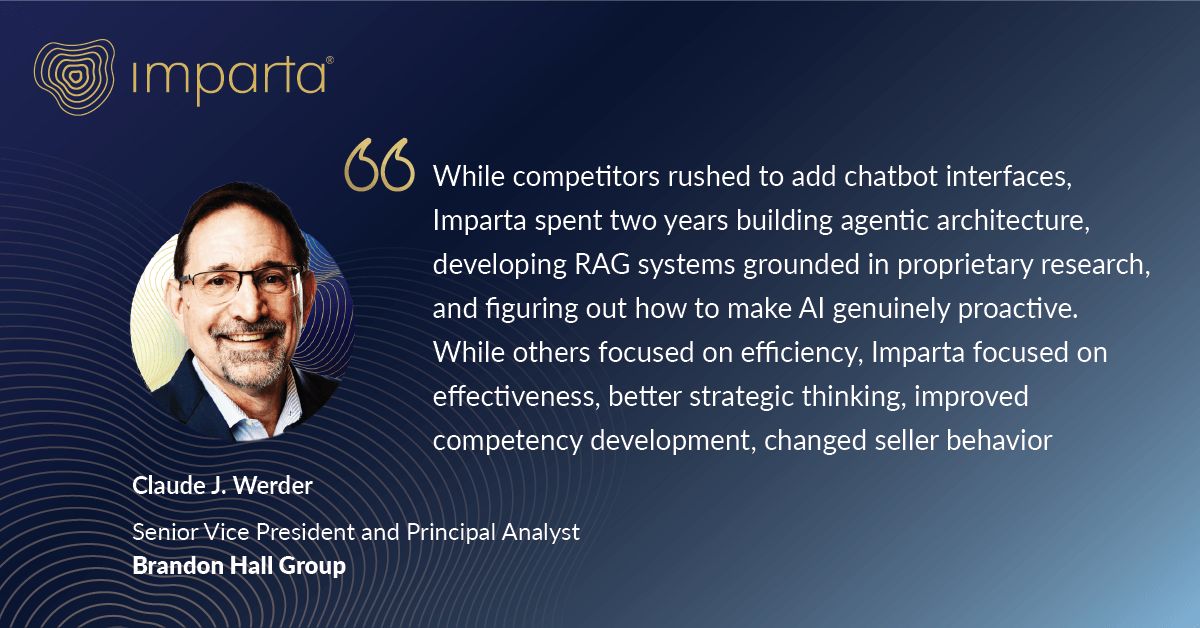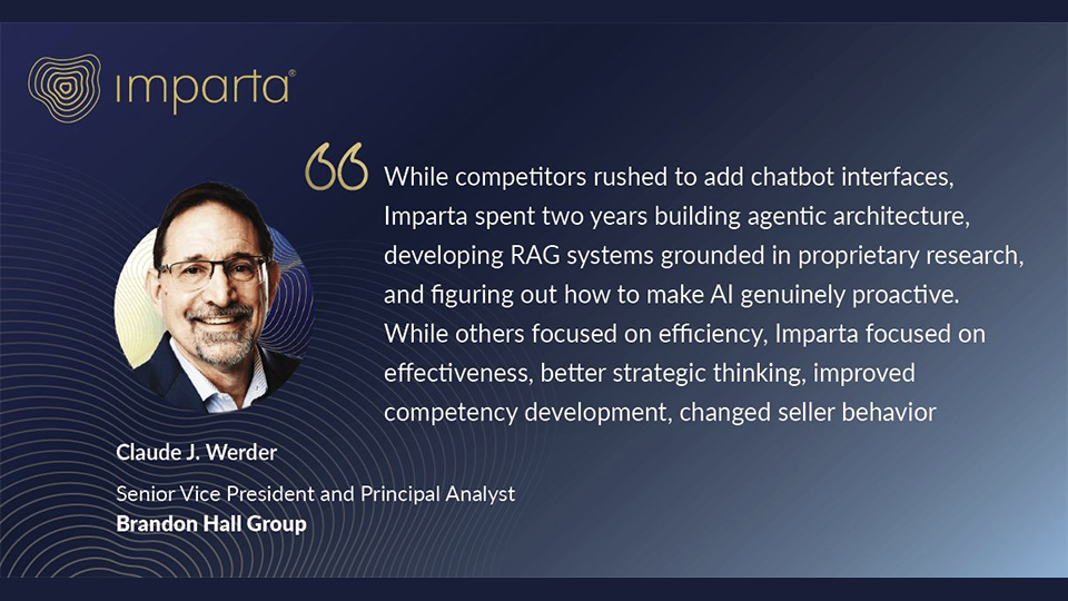 Werder writes, “While competitors rushed to add chatbot interfaces, Imparta spent two years building agentic architecture, developing RAG systems grounded in proprietary research, and figuring out how to make AI genuinely proactive. While others focused on efficiency, Imparta focused on effectiveness (better strategic thinking, improved competency development, changed seller behaviour).”