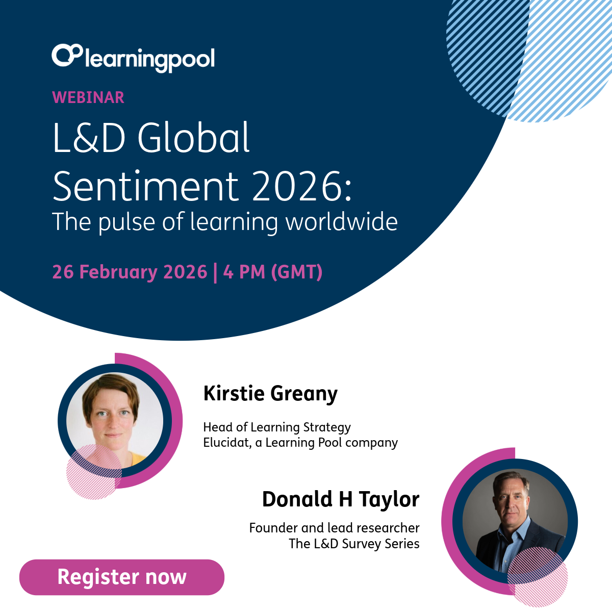 The session brings together Donald H Taylor, founder and lead researcher of the annual L&D Global Sentiment Survey, and Kirstie Greany, Head of Learning Strategy at Learning Pool, to unpack the latest data and insights shaping the year ahead.